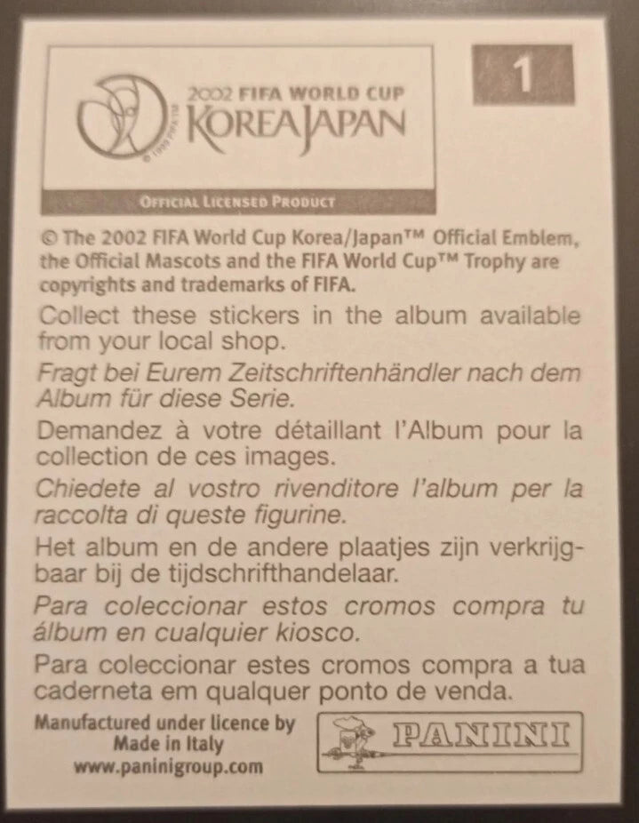 Reverso: Incluye el número 1, el logotipo oficial del mundial 2002 y los sellos de autenticidad de Panini fabricado en Italia.